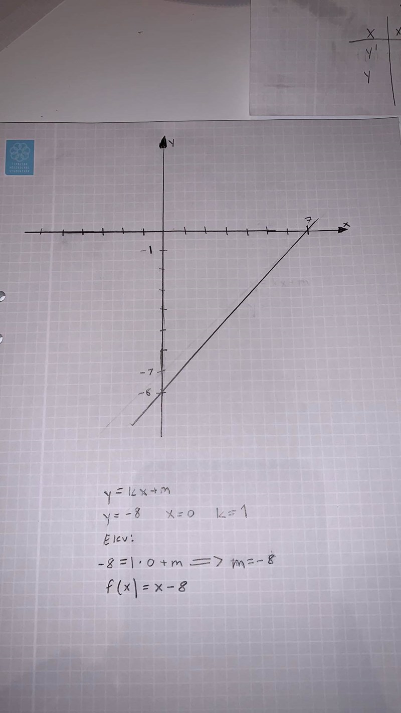 Funktionen uppfyller kraven i uppgiften men i din bild: vad är f(7)? Stämmer det med f(x)=x-8?