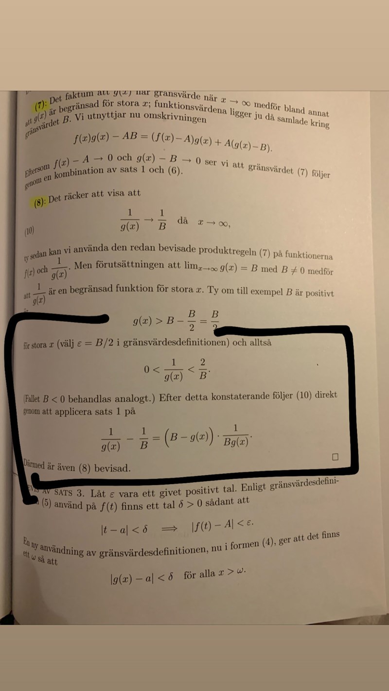 Jag förstår inte det markerade området. Hur har man kommit fram till olikheten och 1/g(x)-1/(b)? Det är bevis av gränsvärde (kvotregeln).