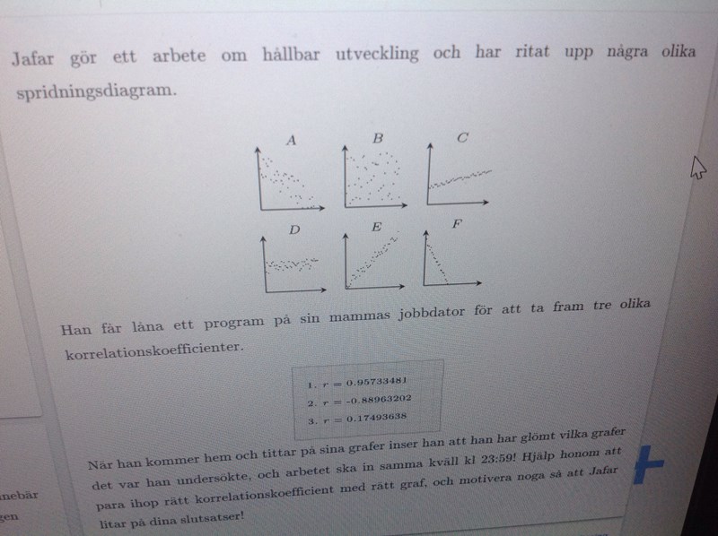 r=0 borde vara D, r=-1 borde vara F och r=1 borde vara E efter som det är ingen korrelation alltså rakt, negativ osäker men tror F eftersom den minskar konstant och E eftersom den ökar konstant