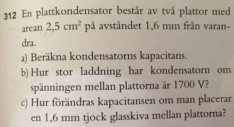 En plattkondensator består av två plattor med aren 2,5 cm^2 på avståndet 1,6 mm från varandra.