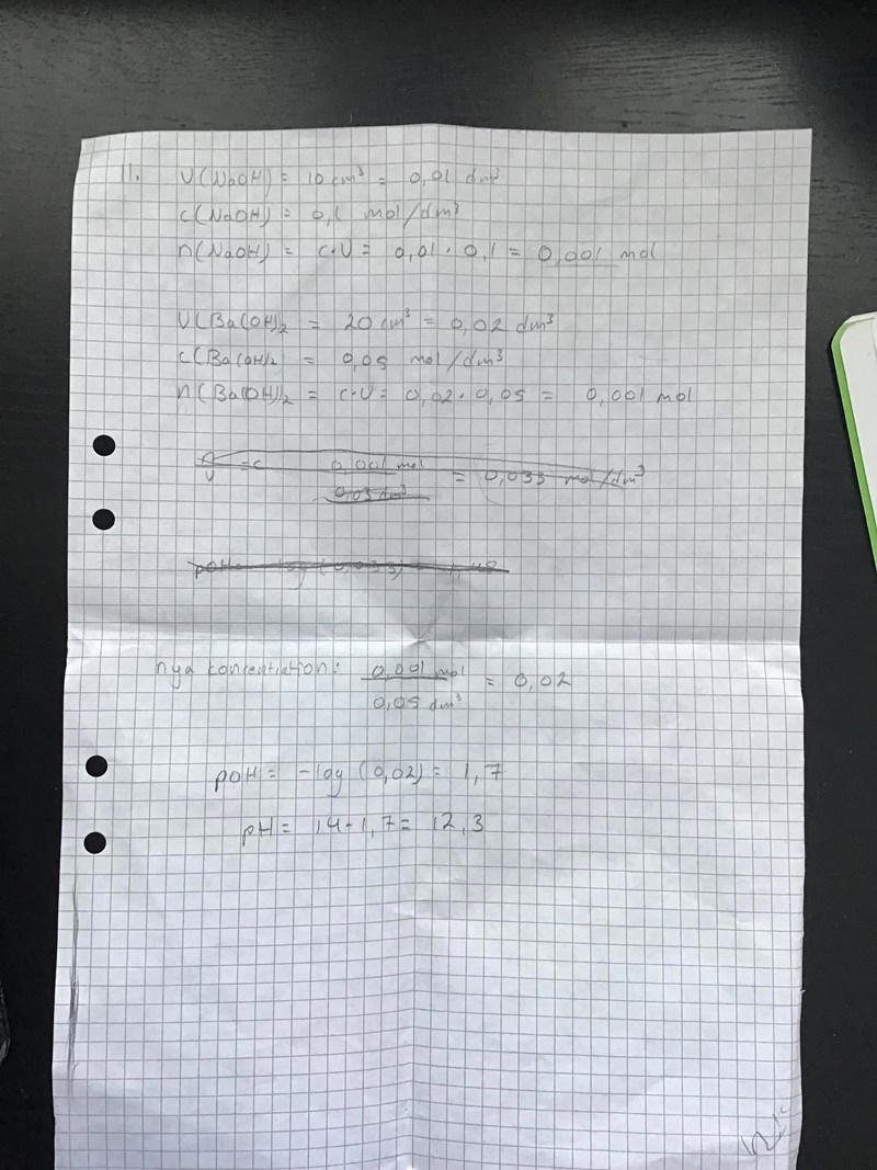 Man blandar 10,0 cm^3 NaOH lösning med koncentrationen 0,100 mol/dm^3 och 20,0 cm^3 Ba(OH)2 lösning med koncentrationen 0,050 mol/dm^3. Blandningen späds sedan till 50,0 cm^3. Vilket pH värde får den slutliga blandningen?