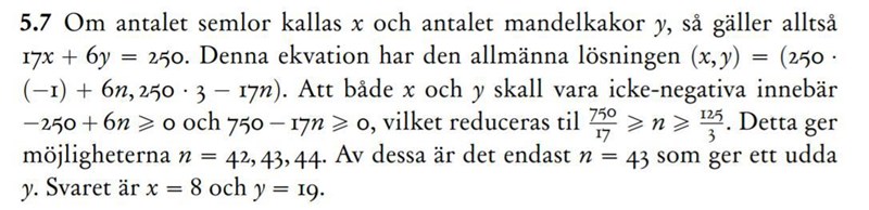 Nu var det iofs ekvationen 17a+6b=250 vi sökte lösningar till. Alltså multiplicerar vi med 250