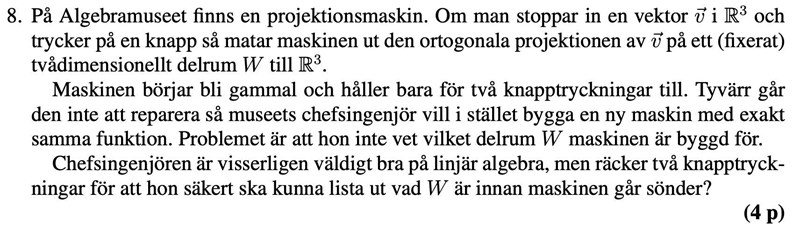 Det är en 4 poäng fråga i den svåraste del av tentan, vad måste man säga här? Jag tänkte att det är bara att projicera två oberoende vektorer som spänner upp ett plan? Vad annars måste man skriva? Vad måste man inse här?