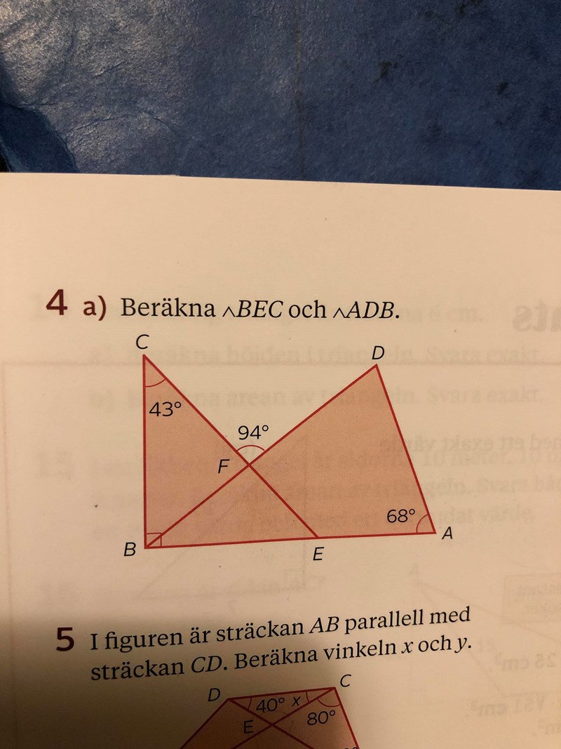 att räkna ut ^BEC var ganska enkelt då man kunde lista ut 2 utav de 3 vinklarna men samma kan inte sägas om ^ADB. ADB bara 1 identifierad vinkel, 68°. Jag chansade bara med att anta att vinkel B var 45, eftersom det delade på rätvinkeln i 2 delar. Jag vet inte riktigt vad man ska göra här, hjälp?