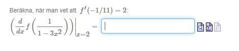 Jag förstår inte hur man ska beräkna detta. Får det bara till 2... eftersom d/dx f = f' sedan är 1/(1-3x^2) då x = 2, = -1/11. Så F'(-1/11) = 2. Men det är fel.