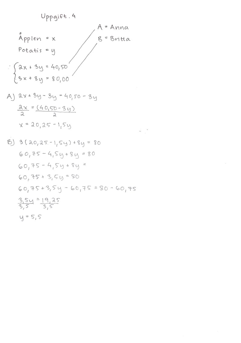 Du är alltså klar, men det rekommenderas att du även beräknar kilopriset för äpplen och kontrollerar att dina värden på x och y löser var och en av dina ekvationer.