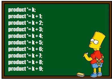 eller något annat tal, och sedan ska koden som följer beräkna vad produkten av talen mellan k till k + 9 är.