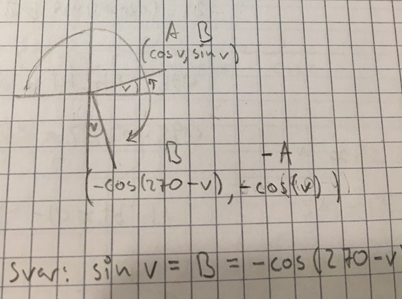 Okej, då får jag koordinaterna för v till (cos v, sin v) = (a,b) och koordinaterna för 270-v till (-sin(270-v),-cos(270-v)) = (-b,-a). Som en parantes fick jag fram detta genom att testa mig fram, t.ex. sin 10 = -cos(270-10).