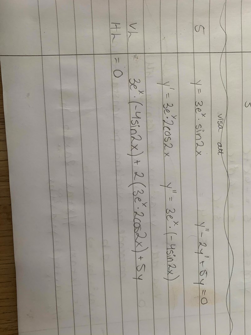 visa att y=3e^x•sin2x  är en lösning till differentialekvationen y”-2y’+5y=0