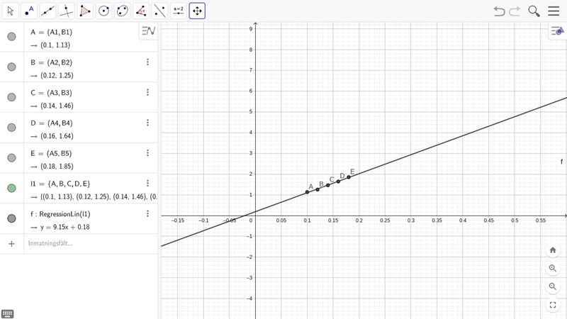 Vi beräkna hur långt tid det tar för den att snurra ett varav, och mha det tiden skulle vi beräkna centripetalkraft. Sedan skulle vi lägga väderna i geogebra, alltså ska x värden vara alla olika vikter vi använde oss av, och y-värden ska vara centripetalkraften, och detta skulle ge oss en graf. Min graf såg ut så här: