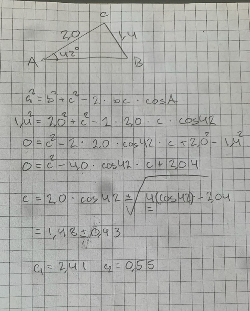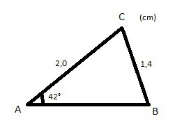 I en triangel ABC är vinkel A = 42 grader, sträckan AC = 2,0 cm och sträckan BC = 1,4 cm.