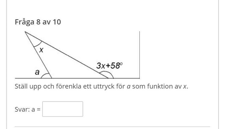 Två vinklar i triangeln är x och (180-a). Yttervinkeln är 3x+58. Hjälpte det?