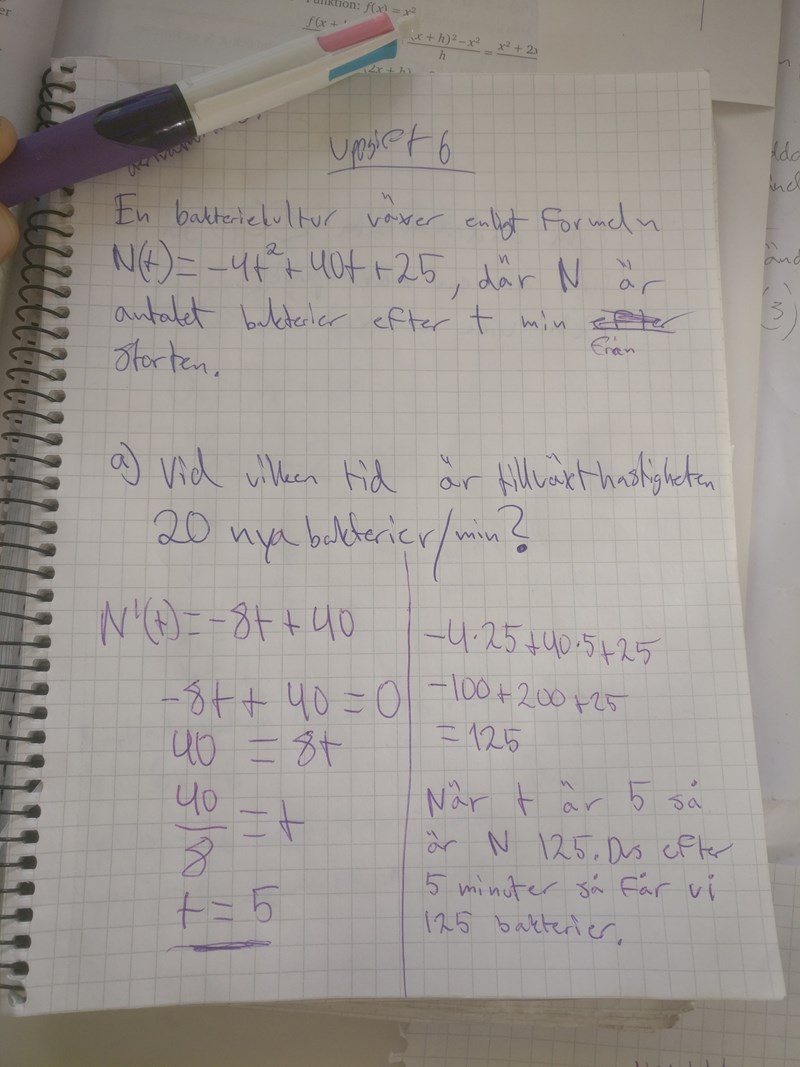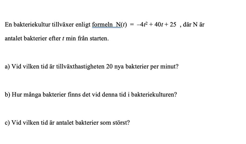 Nej, det du har räknat ut är c-uppgiften. För a-uppgiften skall du beräkna vid vilken tid bakterietillväxten är 20 bakterier per minut, d v s du skall lösa ekvationen N'(t)=20, alltså -8t+40=20.
