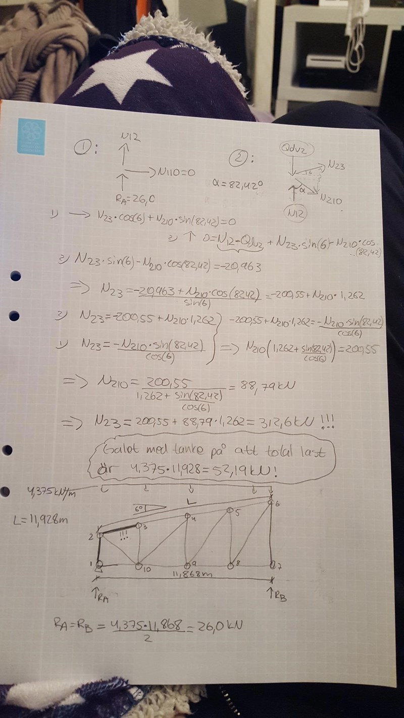 Någon som orkar kolla vad som kan ha gått snett? Alternativt om någon vet någon sida där man kan få alla stångkrafter uträknade, så att man kan jämföra?