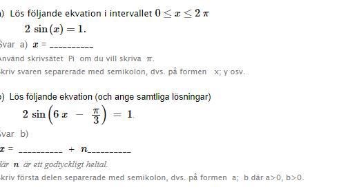 Fick svaret x= pi/6+2npi och 5pi/6+2npi. Är dock inte säker om det är korrekt svar och på b så fick jag svaret x=pi/12+npi/3 och 7pi/36+npi/3.