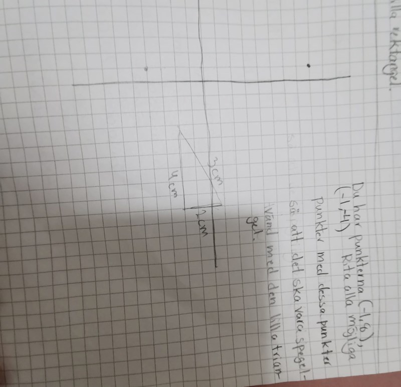 Hypotenusan är 4 och andra akten är 3 så det är tvärtom man ska lägga ga alla möjliga punkter som det går med dessa två så att det ska vara spegelvänd med den lilla