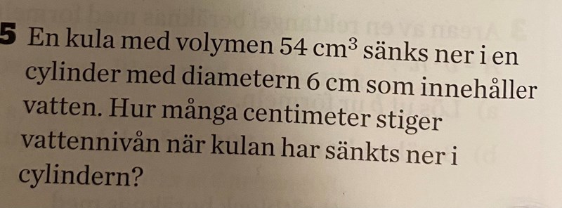Du ska beräkna höjden av en vattencylinder med diametern 6 cm och volymen 54 cm3.