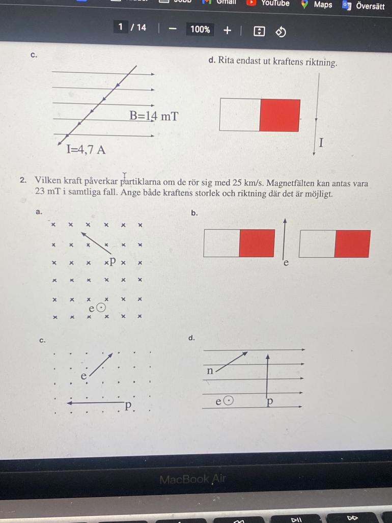 Hej, har svårt att förstå 2a när det gäller elektronen. I facit står det att elektronen inte har något kraft, kan någon förklara varför det är så och vad som skiljer sig från 2d där den har en kraft. Jag förstår ju såklart att det har något med magnetfältet att göra, men vill gärna ha en förklaring så jag får mer förståelse!