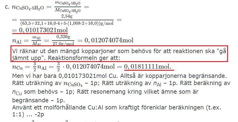 Frågan är vilket ämne som tar slut först, alltså vilken som är begränsad. Jag undrar om jag får en uppgift på provet liknande denna, ska jag då först ta ut substansmängden för båda ämnena, sedan kolla substansmängd förhållandet och till sist ta fram hur mycket som krävs för att reaktionen ska gå "jämt ut" men hur kan jag veta vilket ämne jag ska testa som går "jämt ut"? Det fasta ämnet som läggs i lösningen eller?
