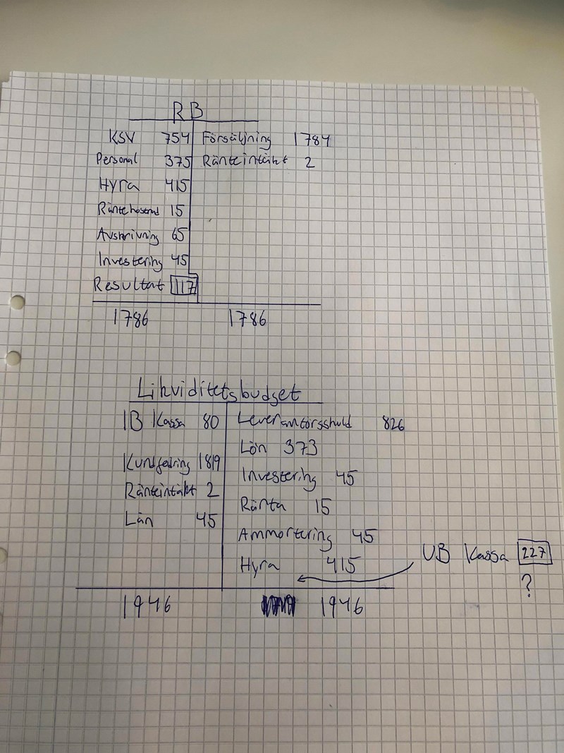 Jag har gjort en resultat budget och den gick bra kom fram till korrekt svar. Det är när jag gör likviditetsbudgeten något går snett. Jag bifogar en bild på mina uträkningar så får du se hur jag har gjort.