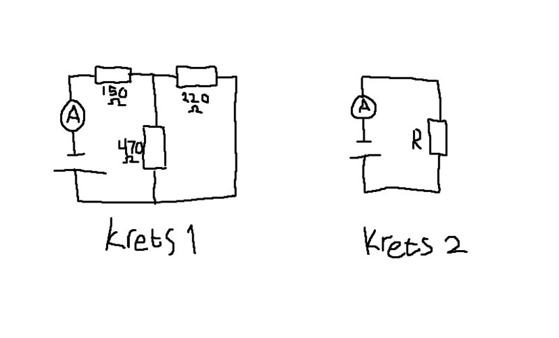 Krets 1s resistorer har 470 ohm, 220 ohm och 150 ohm och amperemätaren är efter alla.