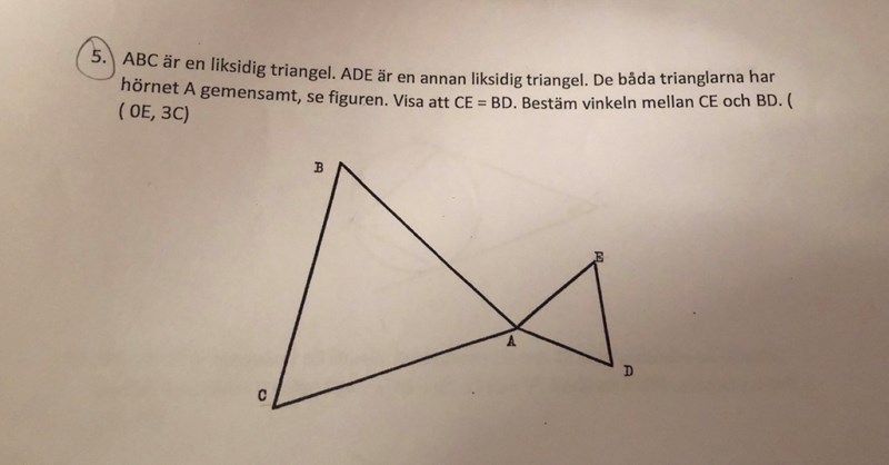 Vinkel BAD = vinkel CAE eftersom de har en gemensam delvinkel (BAE) omgiven av 60 gradersvinklar.