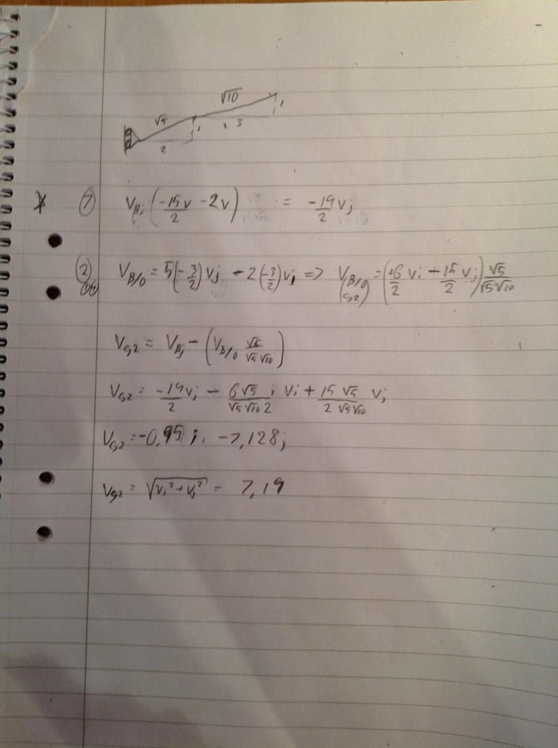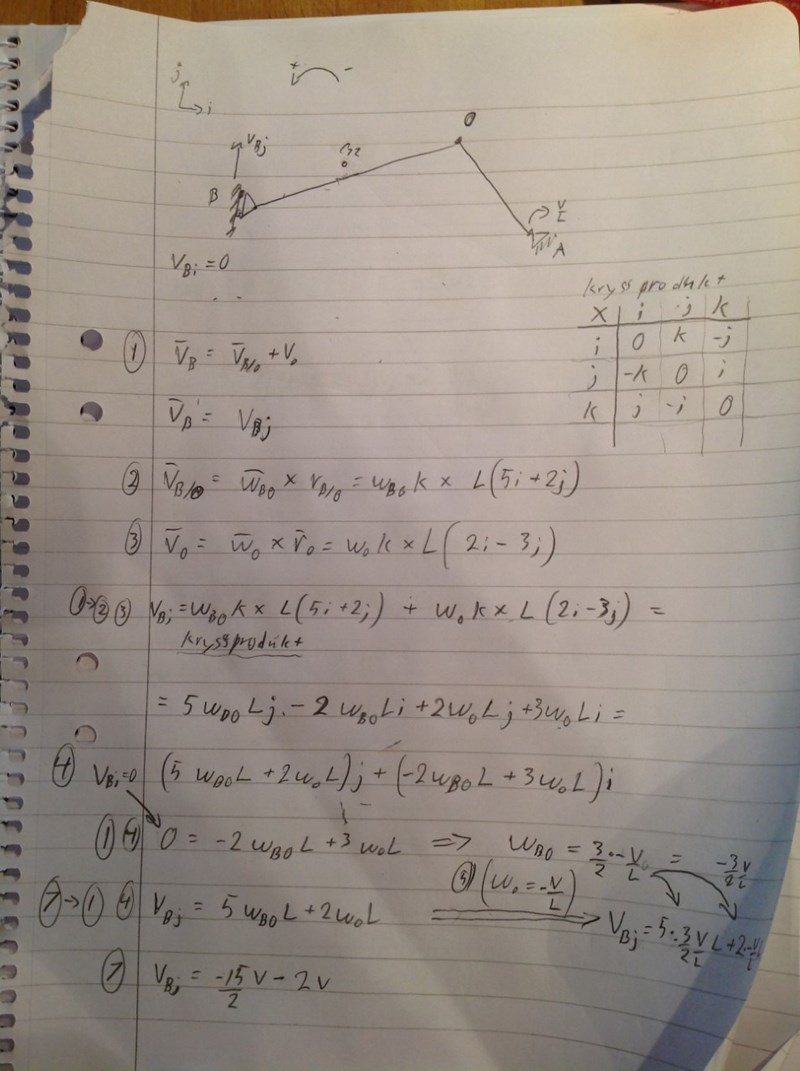 Jag tycker din räkningar ser ok ut fram till det du kallar , där du utnyttjat att är noll i -led. Men sedan får du ett teckenfel, i -led måste med positivt tecken (sanity check). Dessutom behöver du egentligen inte räkna ut hela VB, det räcker med och som du redan beräknat!