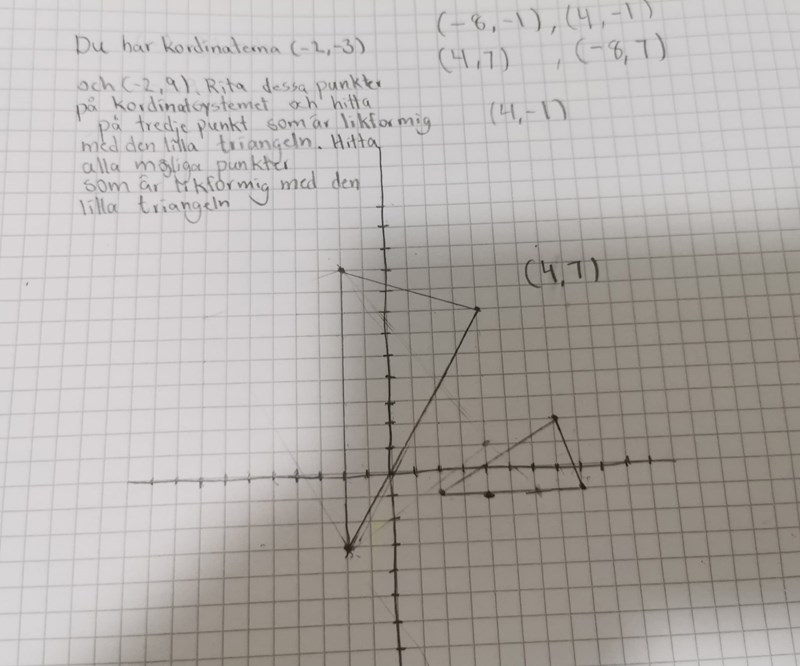 Du har hittat de koordinater som man får om man vrider den lilla triangeln 90 eller 270 grader och förstorar den så den passar in på de två givna punkterna, dessutom speglat.