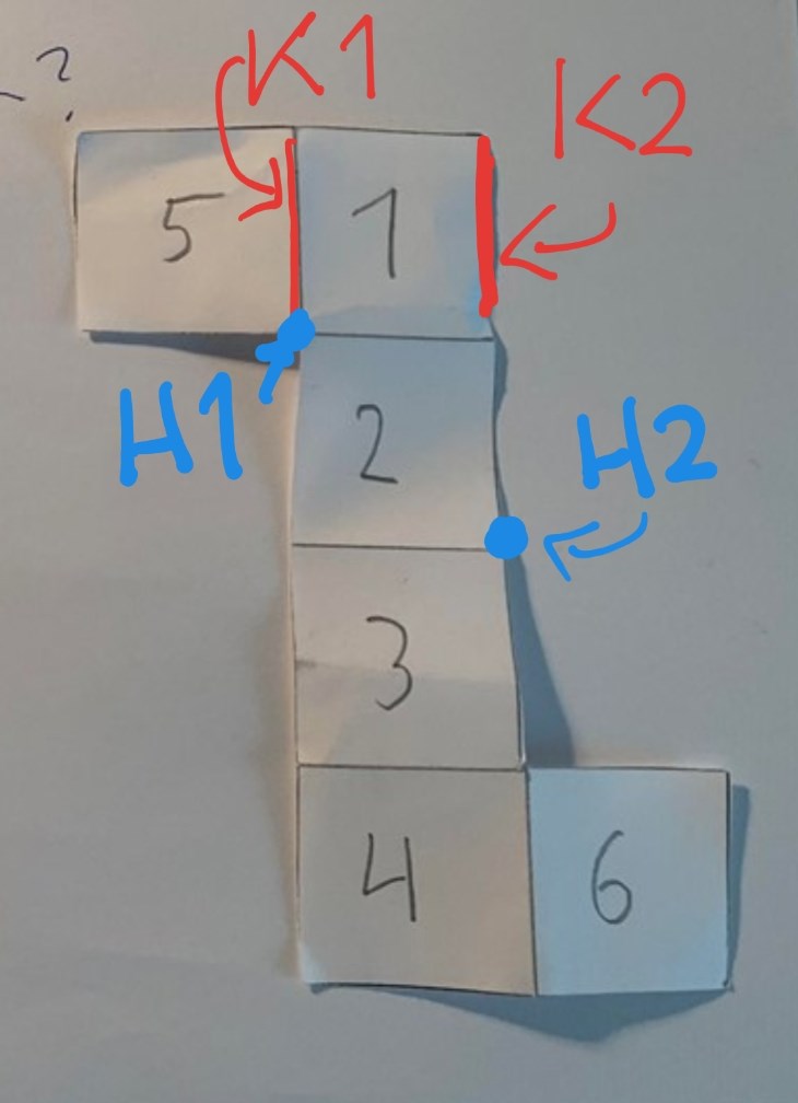 Pass 2 - Namnge kanter och hörn: Utgå från sida 5 igen. Gå mot sida 1. Den kant du då kommer till är K1. Sväng höger och gå längs med den kanten tills du kommer till ett hörn. Det hörnet är H1.