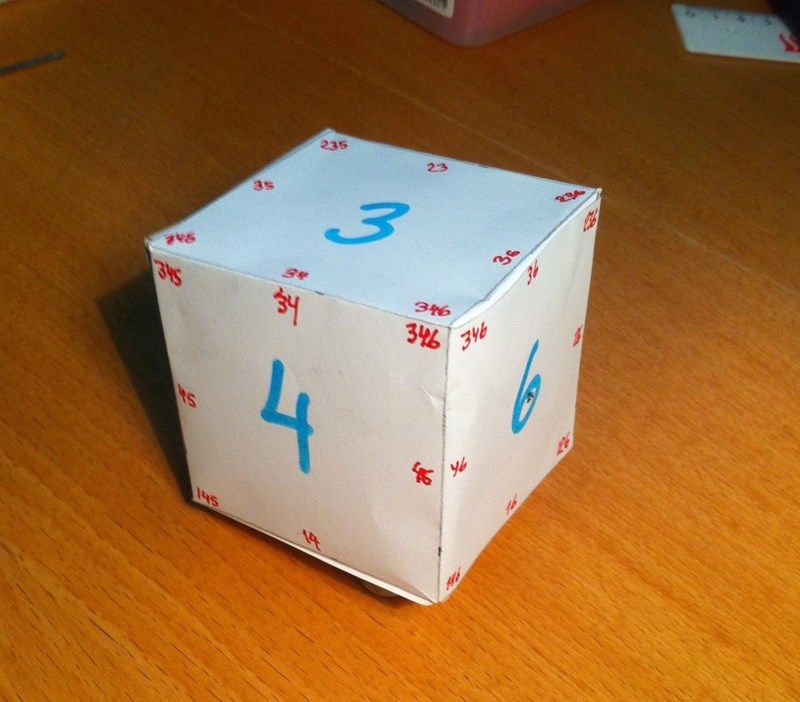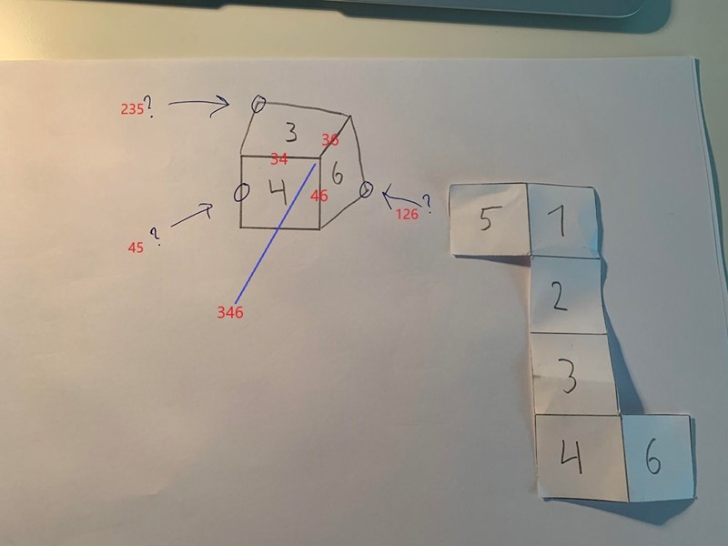 Man har en utvikt kub som är med siffror och en blank ihopvikt kub som man sedan ska placera in nummer på. Den utvikta kuben kan också ha 7, 8, 9 nummer. Jag förstår hur man lägger in siffror på sidorna då kuben har 6 sidor men inte på kanter och hörn?