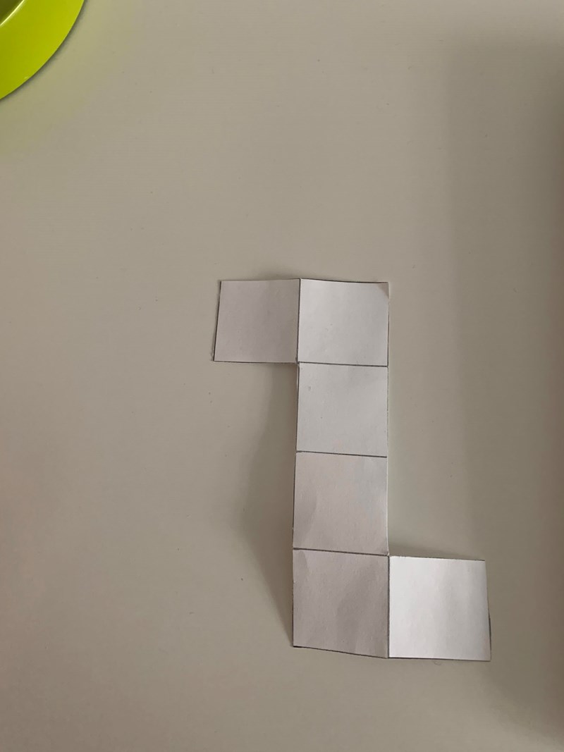 Tänk att du limmar ihop den utvikta kuben sida 1 mot 4. Låt sida 5 och 6 sticka ut tills vidare.