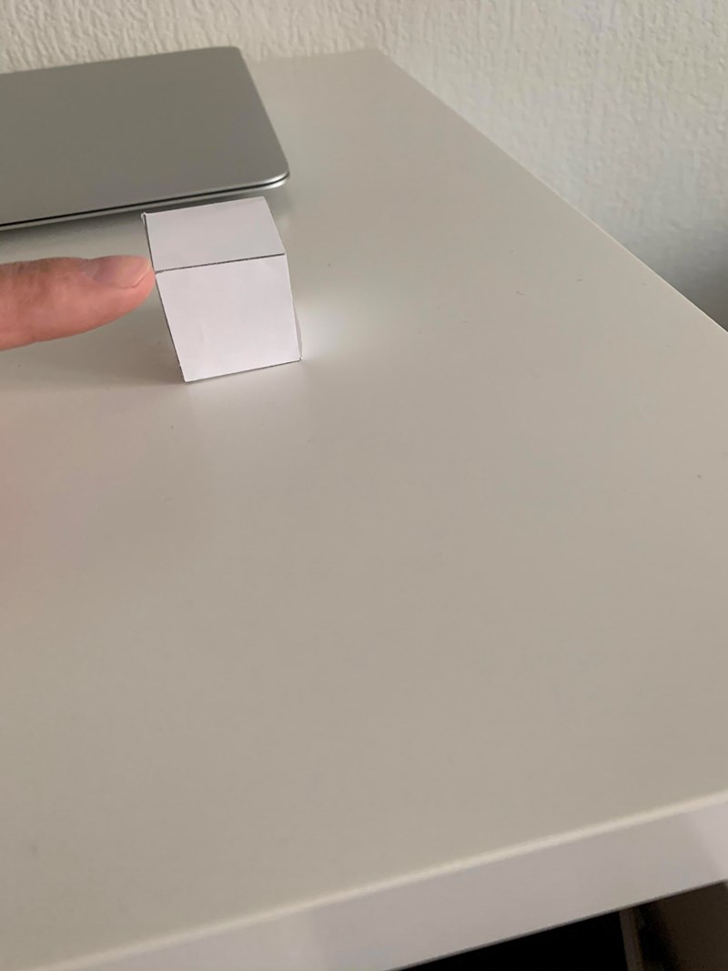 Hela tiden sticker då sida 5 ut till vänster och sida 6 till höger. Vik dessa och limma. Kuben klar.
