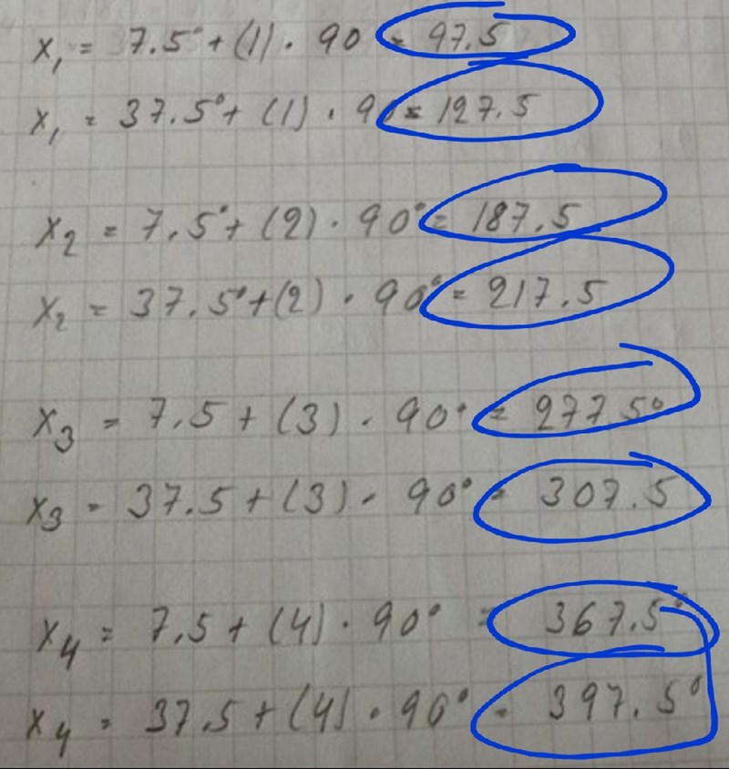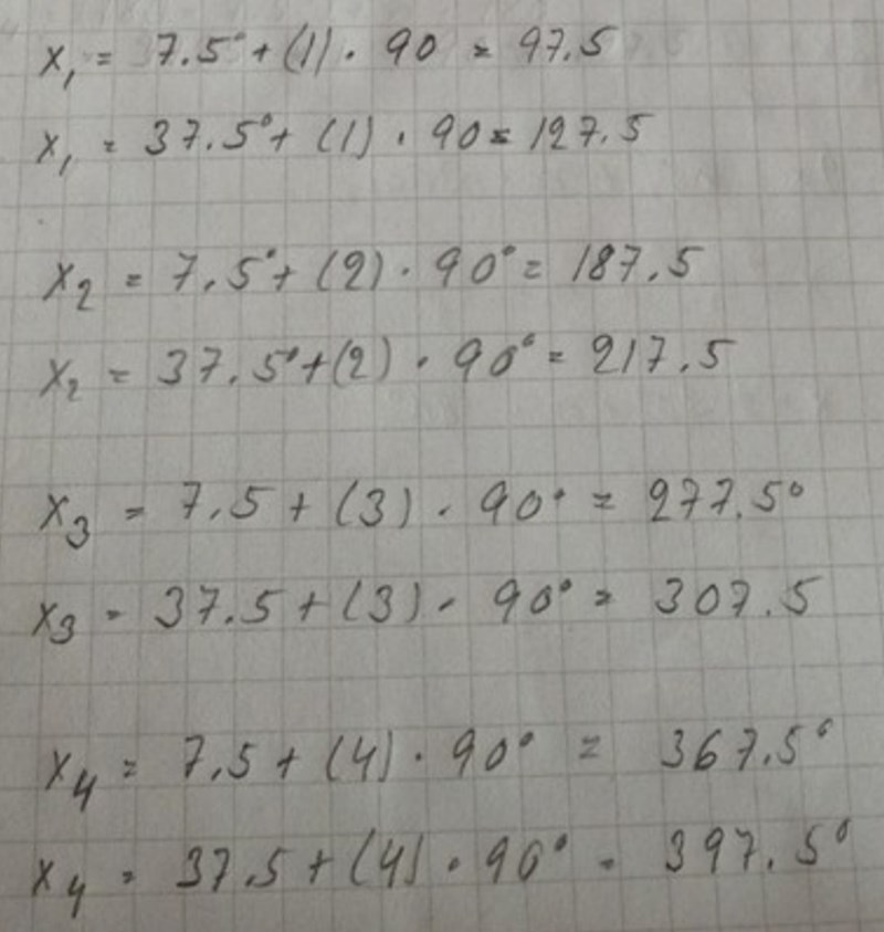 x=(30/4)°+n·90° x = (30/4)^\circ + n\cdot 90^\circ