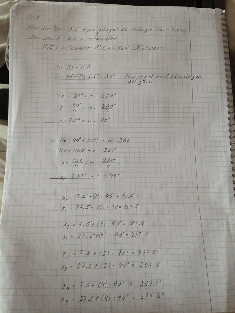 Har sin 4x=0.5 fyra gånger så många lösningar som sin x=0.5 i intervallet.0.5 i intervallet 0°x<360°. Motivera!-------------------hör inte till uträkningensin 4x=0.5(miniräknaren ger30°-------------------sin x=0.5här har vi två lösningarx1=30 +n·360°x2=180-(30°) +n·360°------------sin 4x=0.5jag tror att det finns 8 olika lösningarnu undrar jag om skrivsättet, är osäker4x=30°+n·360°   x=7.5°+n·90°  x=(90°-7.5°)+n·90°  x=(90°+7.5°)+n·180°  x=(180°+7.5°) +n·180