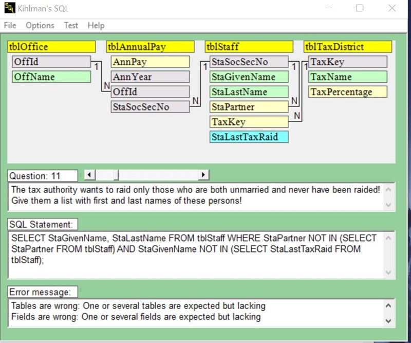 Felmeddelandet du får verkar ju dock antyda att man skulle ha med fler tabeller, jag har dock svårt att se vilka det skulle vara då de andra tre tabellerna inte har något med saken att göra. Det statement du angett kan aldrig returnera några rader, pga "StaPartner NOT IN (SELECT StaPartner FROM tblStaff)".