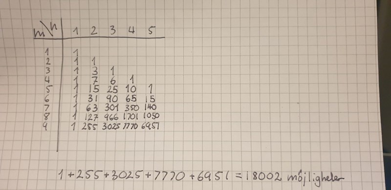 Jag började nöta på b) först och kom fram till 18002 möjligheter, rätta mig gärna om detta är fel svar :) Detta kom jag fram till genom att använda en tabell som följde den rekursiva formeln för Stirlningtalen. likt