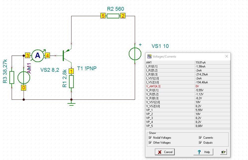 I_R2 borde väl motsvara Ic och I_R2 motsvarar Ie i uppgiften. Enligt va ja sa ovan så är ju då Ie ganska rätt (I_R2) men AM1 (e den på rätt ställe för Ib?) år inte samma och Ic stämmer inte..?