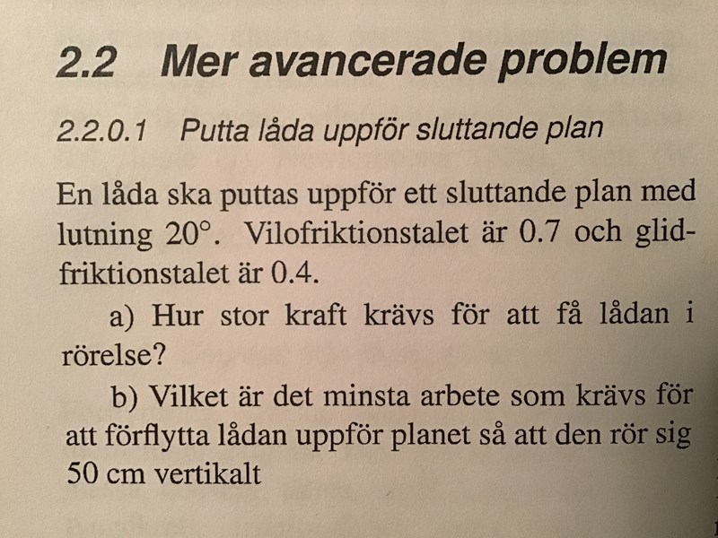 En låda ska puttas uppför ett sluttande plan med lutning 20 grader. Vilofriktionstalet är 0,7 och glidfriktionstalet är 0,4.