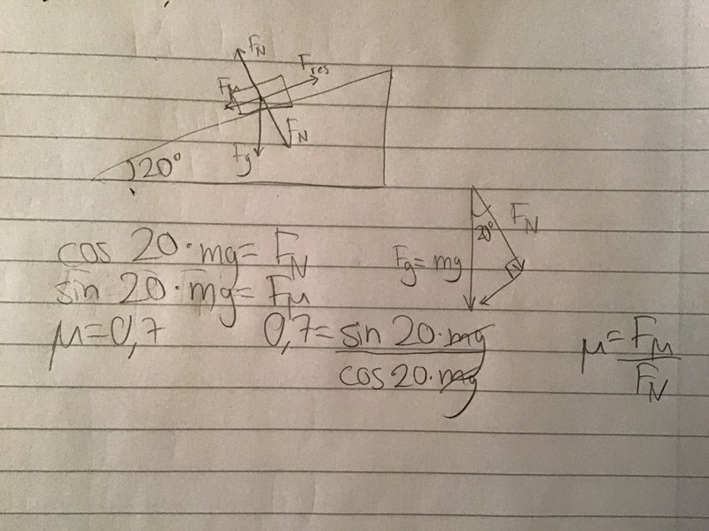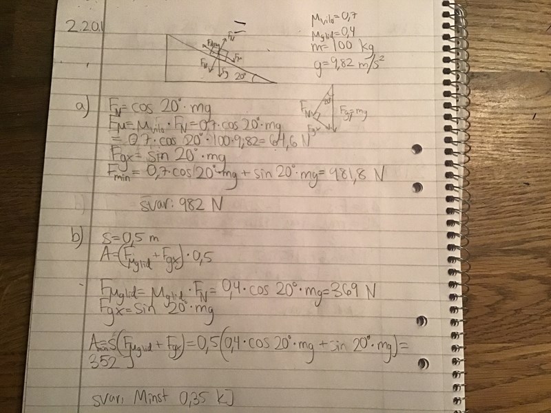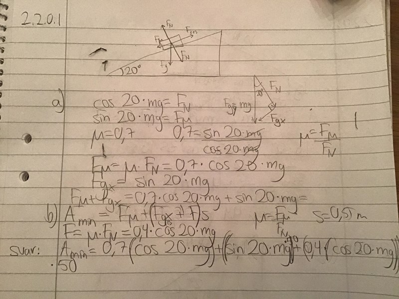 Farbrorgul skrev:En låda ska puttas uppför ett sluttande plan med lutning 20 grader. Vilofriktionstalet är 0,7 och glidfriktionstalet är 0,4.