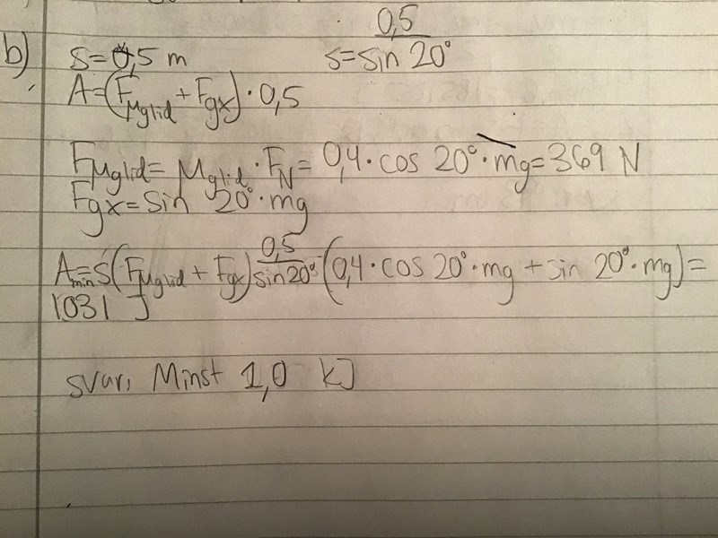 Ber om ursäkt, men jag förstår tyvärr inte alla era beräkningar. Antag att massan är 100 kg. Uppgift a) känns rätt men inte b). A = F * s och Fres är ju Fu(glid) + Fg(x), inte sant? Samtidigt är sträckan 0,5 m, vilket borde innebära 0,35 kJ?