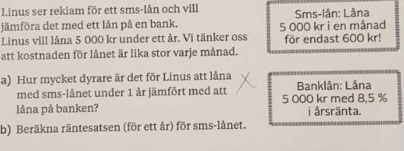 Jag tänkte såhär på a) sms lån: 600x12=7200 7200-5000=2200