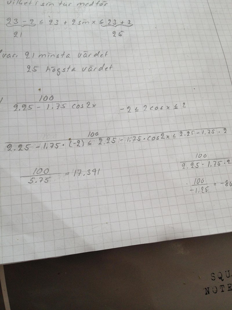 Som sagt, notera att cos(2x) inte är samma sak som 2 cos(x)! cos(kx) har alltid minsta värdet -1 oavsett värde på k samt uttryckets läge (nämnare/täljare) i bråket.