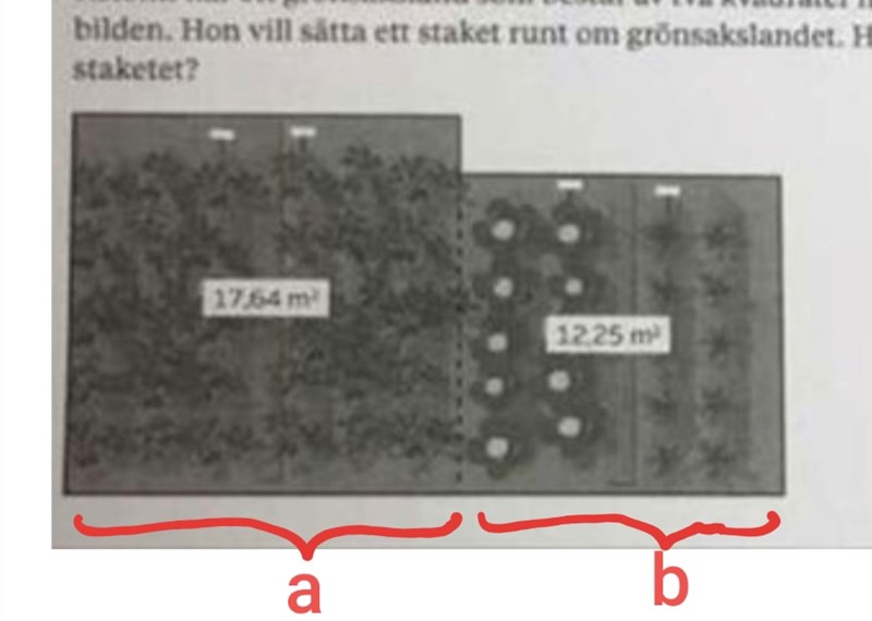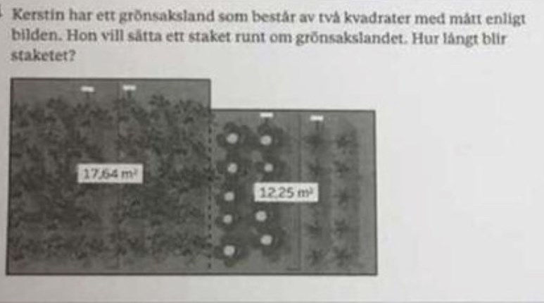 Kerstin har ett grönsaksland som består av två kvadrater med mått enligt bilden. Hon vill sätta ett staket runt om grönsakslandet. Hur långt blir staketet?