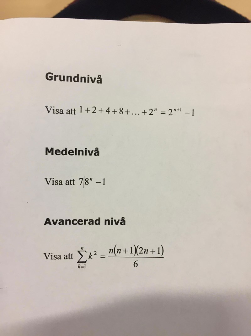 Någon som kan bevisa den på avancerad nivå? Om inte det så går medelnivå oxå bra. Har försökt att använda mig av induktionsbevis på båda men får inte riktigt ihop det. Hade vart ytterst tacksam för hjälp!:)