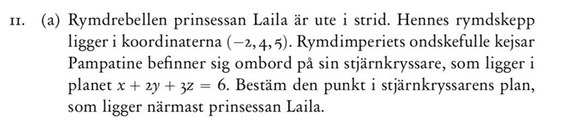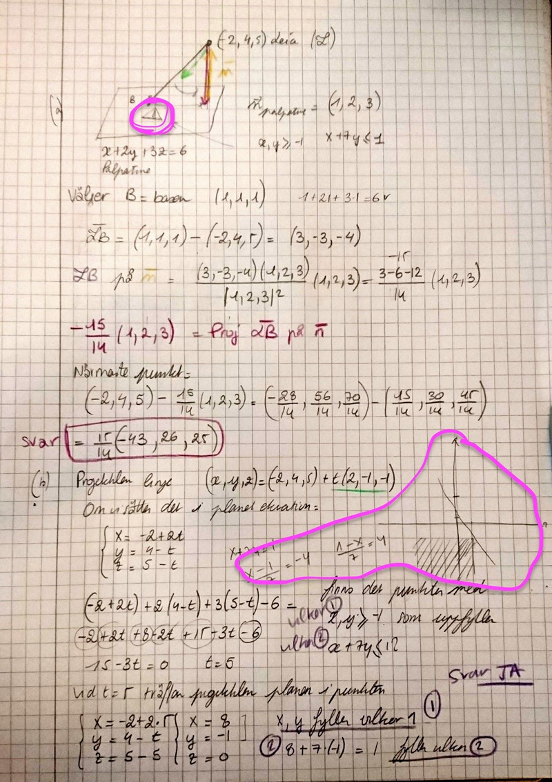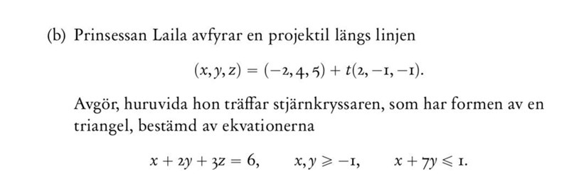 Linjerna begränsar en figur (ledtråd: en triangel). Var ligger hörnpunkterna i xy-planet? Studera också villkoret på z (x+2y+3z=6), hur lägger sig triangeln i rymden?