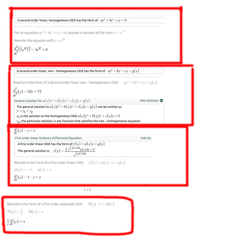 Verkar vara 5 olika typer av differentialekvationer jag ska kunna lösa, det är dom på bilden nedan. Mitt största problem verkar vara att identifiera vilken formel som ska användas när något tips?