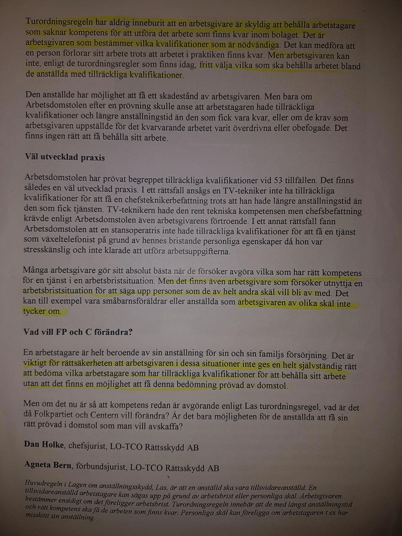 I stycket under rubriken "Vad vill FP och C förändra" så talar de om vikten av trygga anställningar (som de menar hotas av ett avskaffande av turordningsregler). Varför anser de att det är viktigt med trygga anställningar? Varför anser de ur juridisk synvinkel det att det är viktigt med turordningsregler?