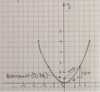 Brännpunkten ligger på samma avstånd från y-axeln fast på och har koordinaterna
