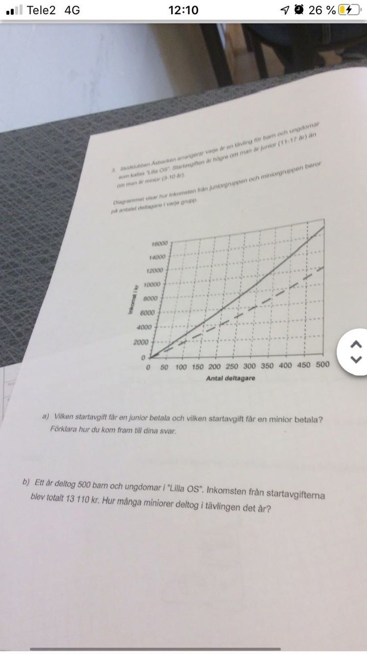 Behandla de två linjerna för sig: den streckade linjen passerar koordinaten (300,6000). Detta innebär alltså att om 300 deltagare från den ålderskategorin deltar får klubben in 6000 kronor. Kan du utifrån detta räkna ut hur mycket de skulle fått in från 1 av dessa deltagare?