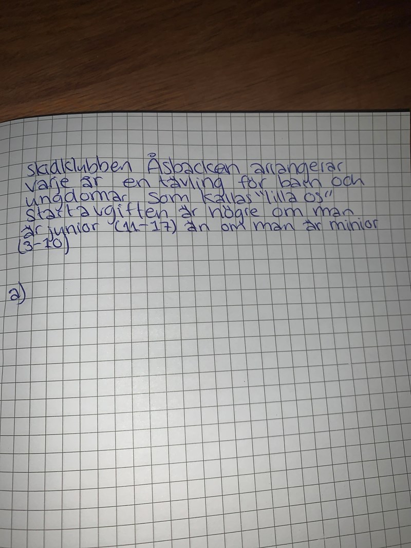 Lägg upp en bättre bild på själva uppgiften, det är svårt att läsa texten.